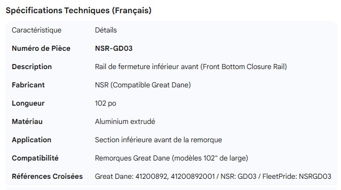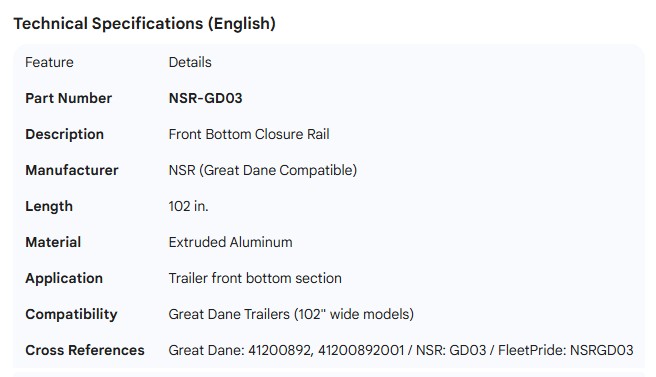 GREAT-DANE FRONT BOTTOM CLOSURE RAIL 102" 41200892001