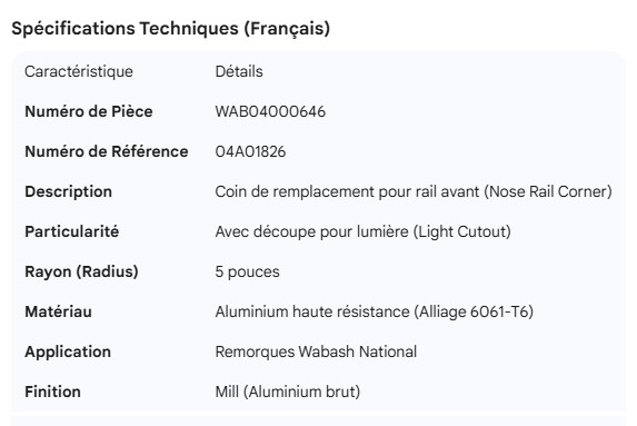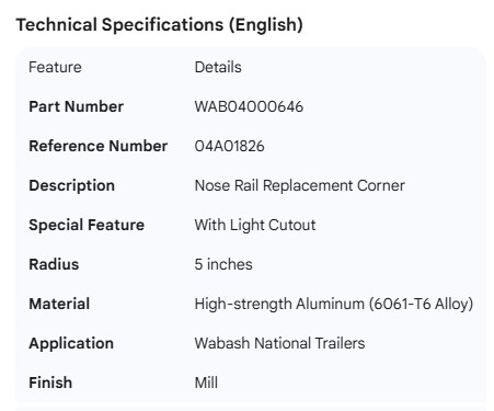 WABASH NOSE RAIL REPLACEMENT CORNER 04A01826 W/LIGHT CUTOUT