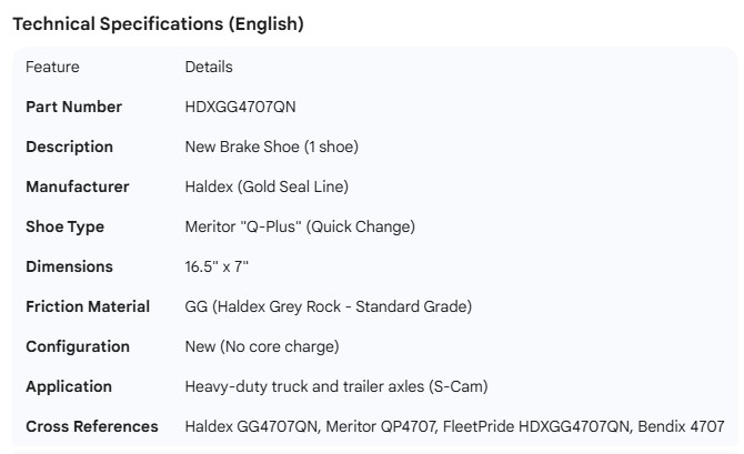HALDEX BRAKE SHOE 4707 NEW (1 SHOE)