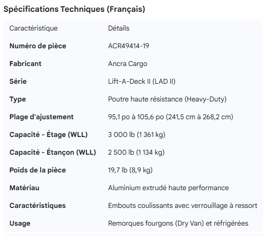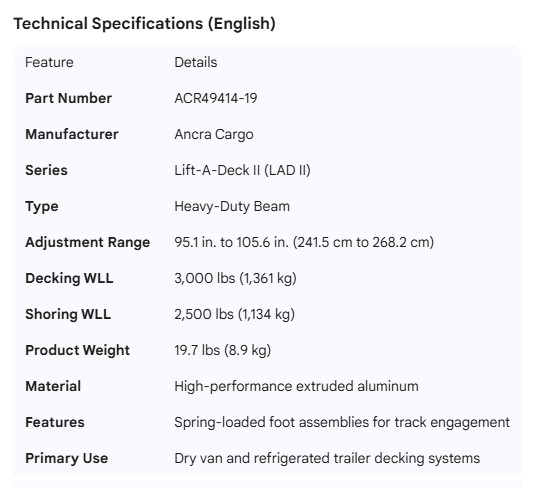 ANCRA LIFT-A-DECK 2 HEAVY DUTY BEAM 95" TO 105"