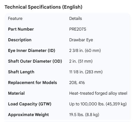PREMIER DRAWBAR EYE 2-3/8"ID SHAFT 2"OD X 11-1/8"L (208,416)