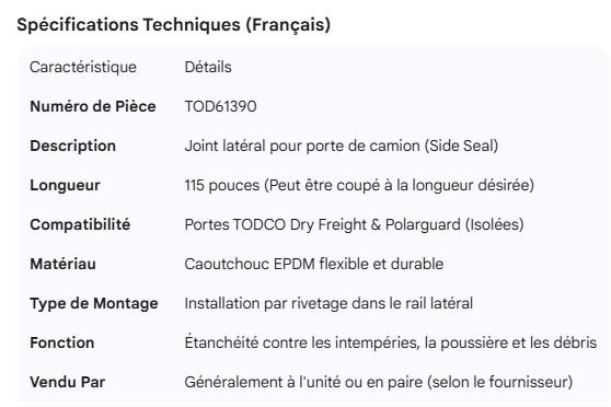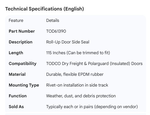 TODCO ROLL-UP DOOR SIDE SEAL 115" DRY & POLARGUARD