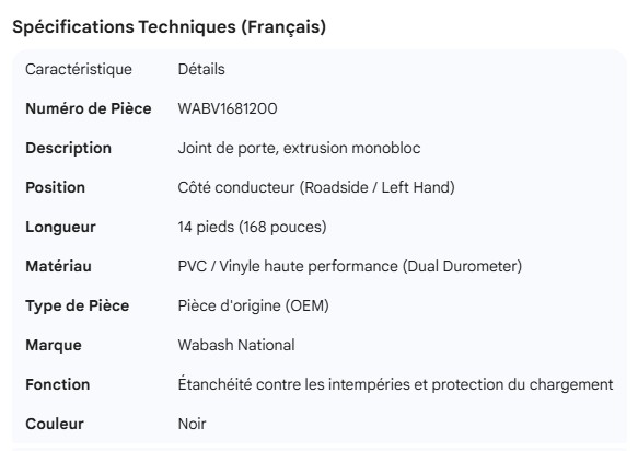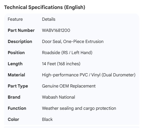 WABASH DOOR SEAL ONE PIECE EXTRUSION ROAD SIDE 14FT