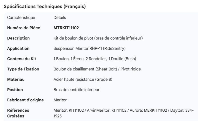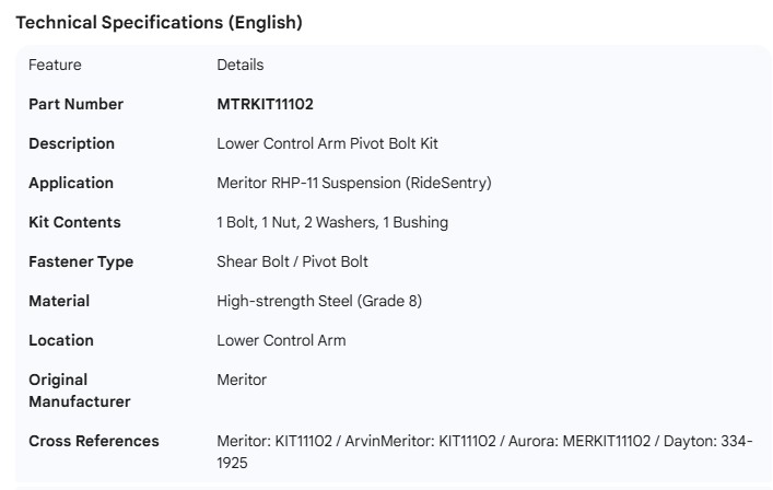 MERITOR LOWER CTRL ARM PIVOT BOLT KIT RHP-11