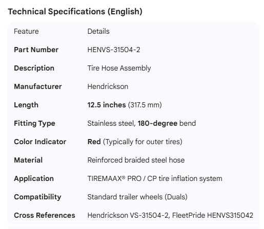 HENDRICKSON TIRE HOSE ASSY RED STEEL 180DEG 12.5"